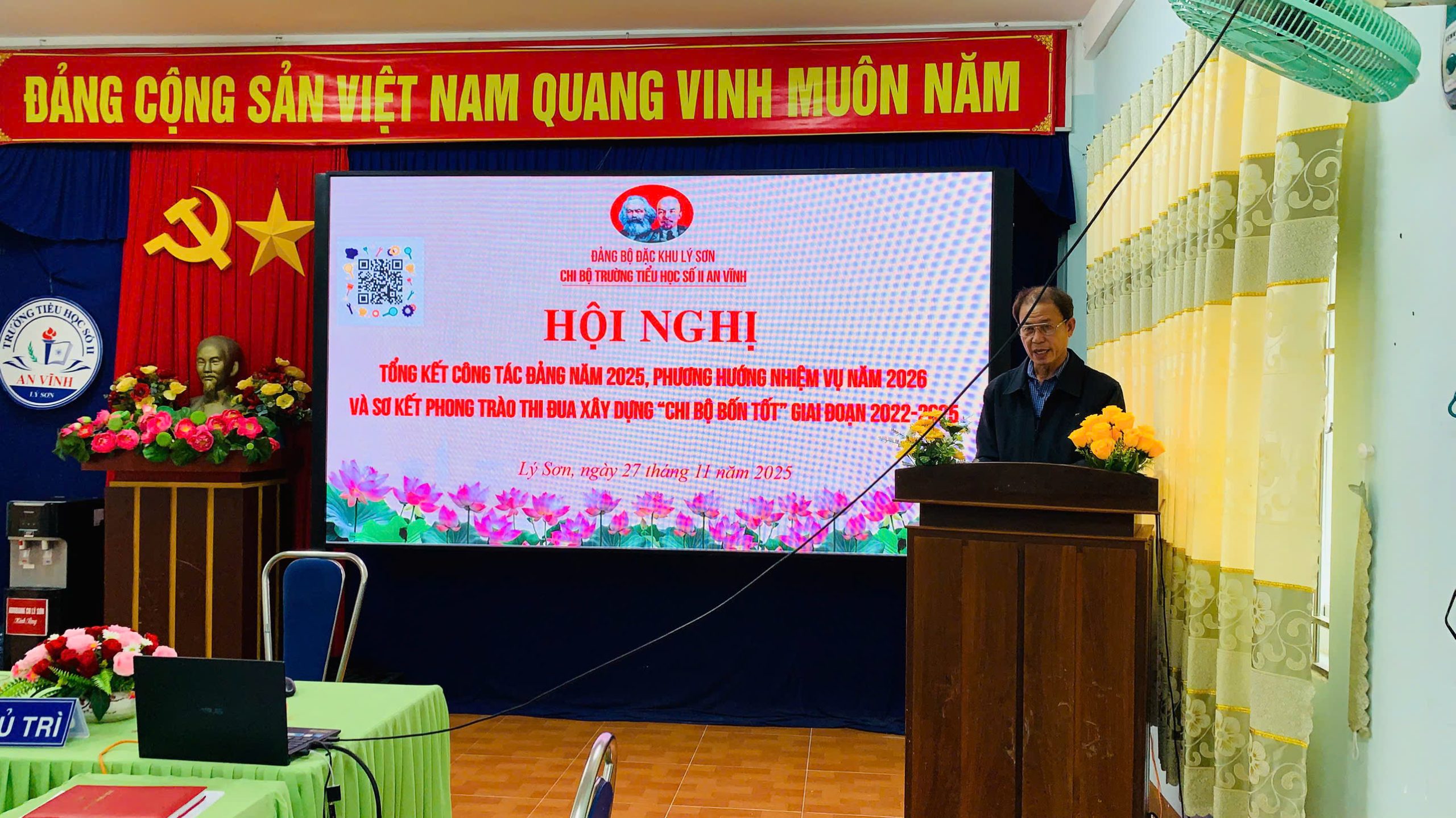 Tại hội nghị, Chi bộ đã đánh giá toàn diện kết quả lãnh đạo thực hiện nhiệm vụ chính trị trong năm 2025. Năm 2025, Chi bộ Trường Tiểu học số II An Vĩnh đã bám sát sự lãnh đạo của Đảng ủy Đặc khu Lý Sơn, triển khai đầy đủ các nhiệm vụ chính trị, thực hiện nghiêm túc công tác xây dựng Đảng. Công tác giáo dục chính trị tư tưởng được duy trì thường xuyên; sinh hoạt chi bộ bảo đảm nền nếp, đảng viên thể hiện tốt vai trò tiên phong, gương mẫu. Chi bộ đã lãnh đạo nhà trường hoàn thành tốt nhiệm vụ năm học, chất lượng giáo dục được nâng lên; các phong trào, cuộc vận động được triển khai hiệu quả, tạo sự đồng thuận trong đội ngũ.